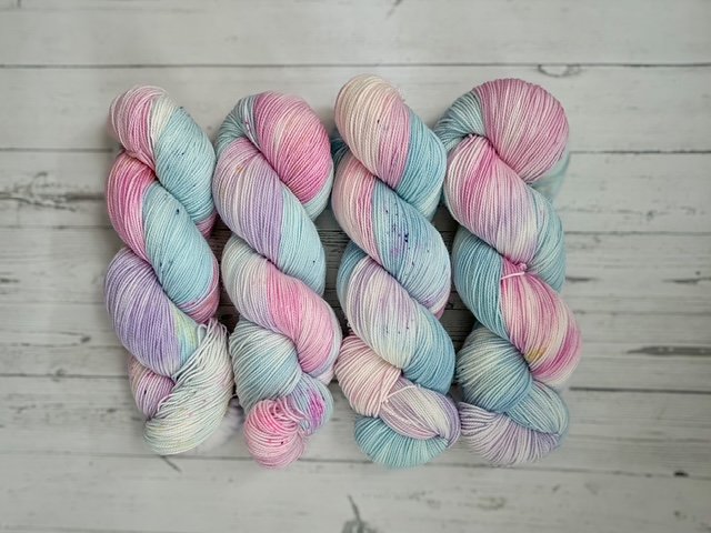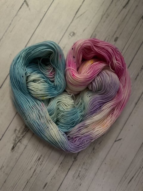 Our classic Candy Rocks colorway in sock yarn and with the addition of light speckles in navy, yellow and magenta.