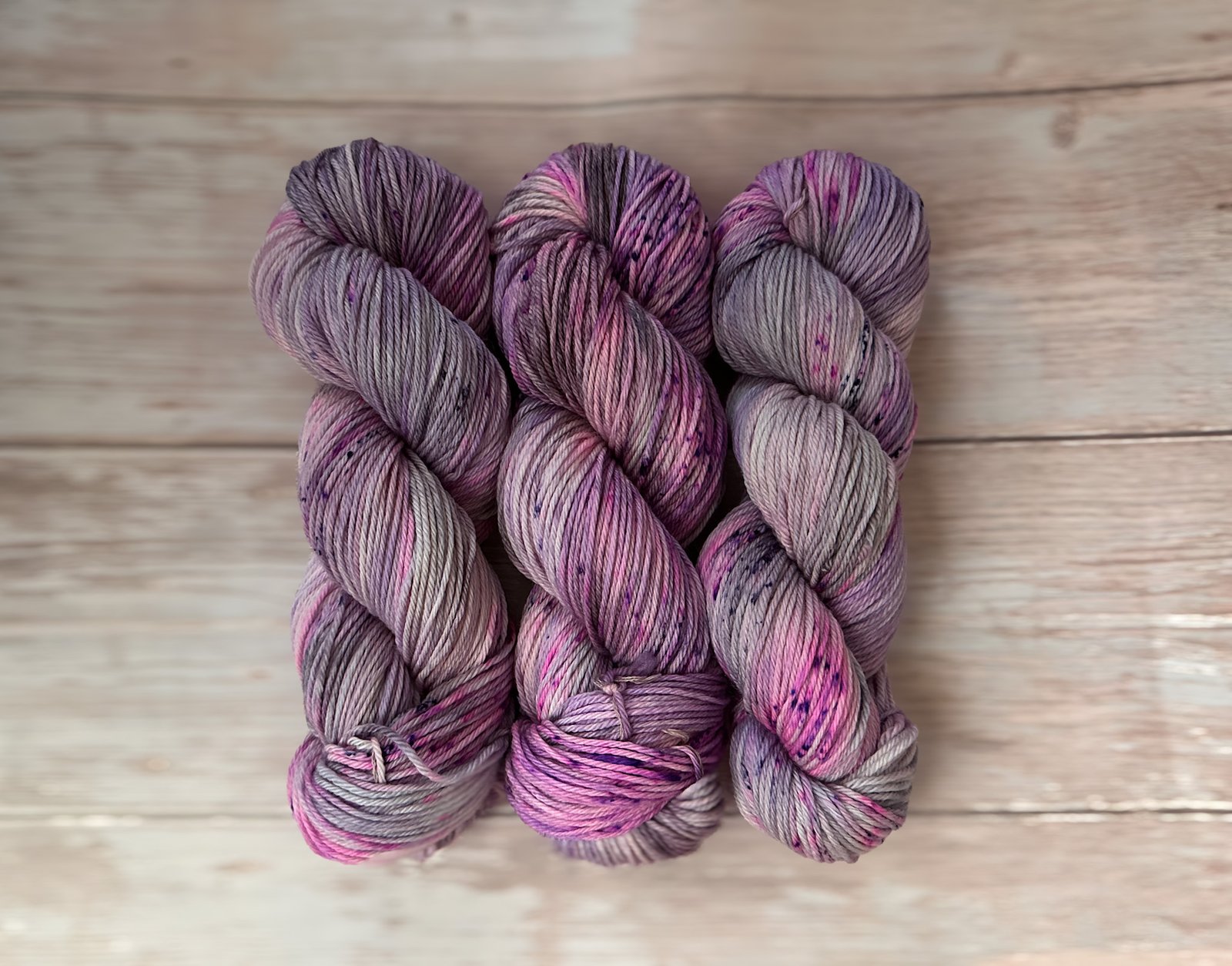 Delicate. Moody. Ethereal. Moonlight Fog is a gently hand-dyed DK weight yarn in a serene blend of muted violet, soft gray, and misty white. With its low-saturation color palette, this yarn evokes quiet mornings, foggy landscapes, and soft shadows—perfect for knitters and crocheters who love subtle, sophisticated tones.